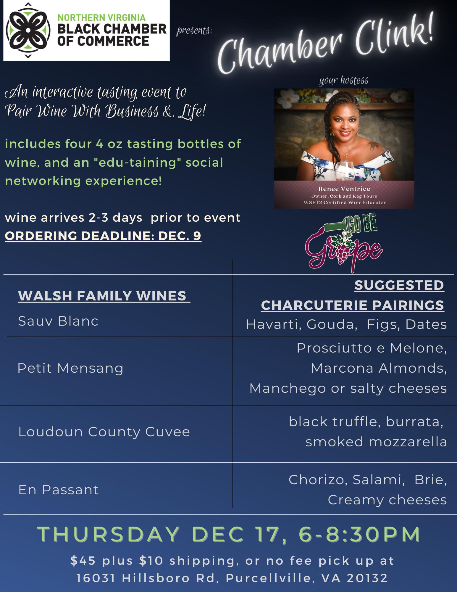 Join the Northern Virginia Black Chamber of Commerce for a Chamber Clink! This is an interactive tasting event, pairing wine with business and life. Featured wines from Walsh Family Wines in Loudoun County and our Wine Educator, Renee Ventrice, from Keg & Cork Tours will host the evening. Order your wine kit by December 9th! Wine will be shipped to your door 2-3 days prior to the event. The wine kit is $45 + $10 Shipping , per person. You may also pick up kit(s) prior to the event: 16031 Hillsboro Rd. Purcellville, VA 20132. One wine kit includes 1, 4oz. bottles of each: Sauv Blanc, Petit Mensang, Loudoun County Cuvee and En Passant. That's right 4 bottles, 4oz each of the wines listed. If you have additional questions or would like to speak with someone about the Northern Virginia Black Chamber of Commerce, please email info@northernvirginiabcc.org or call 703.442.4472.