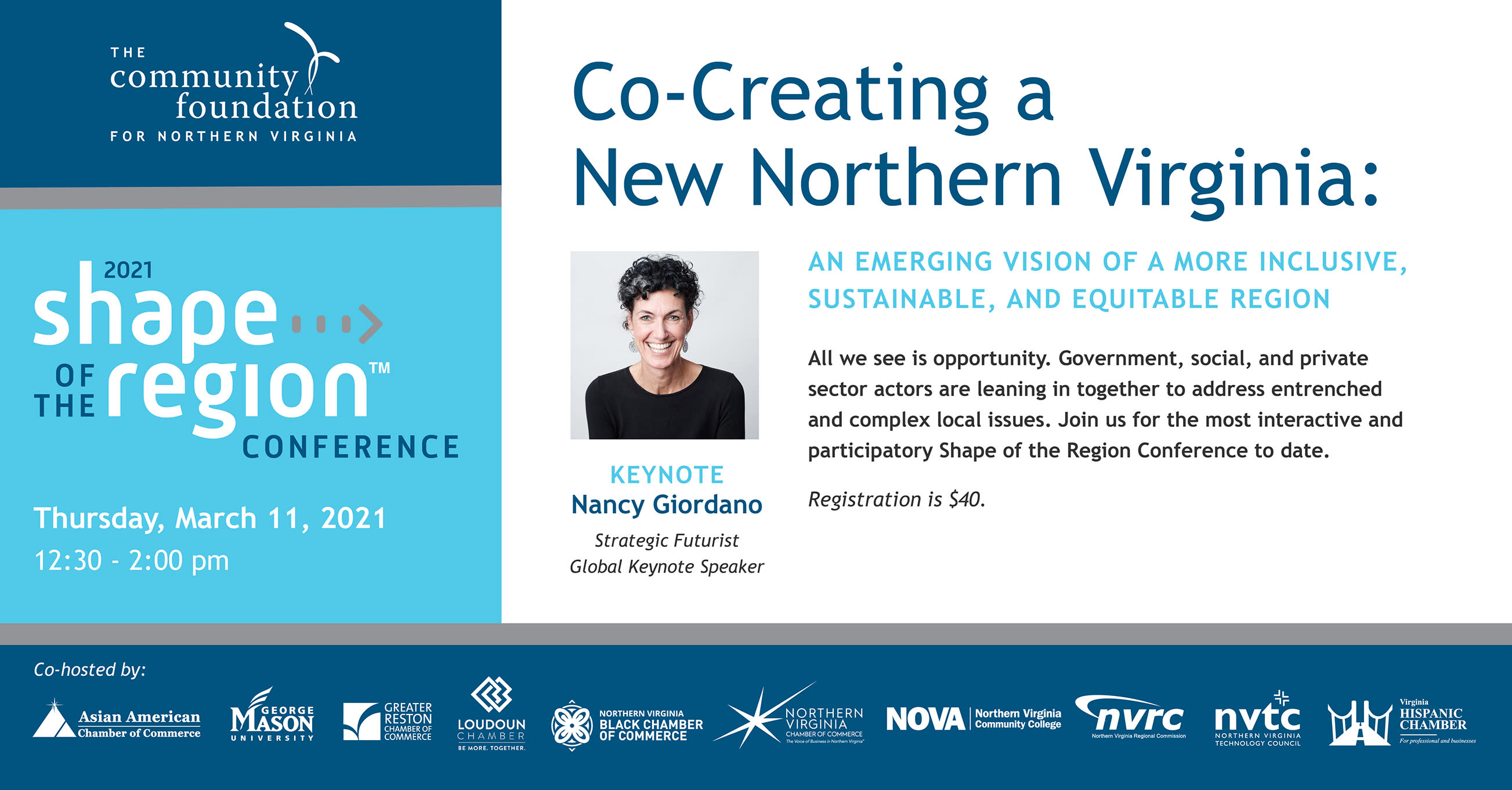 Join us on March 11th for the 2021 Shape of the Region Conference: Co-Creating a New Northern Virginia, hosted by the Community Foundation for Northern Virginia. We are co-presenters of this event which will explore an emerging vision of a more inclusive, sustainable, and equitable Region.